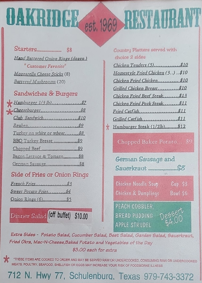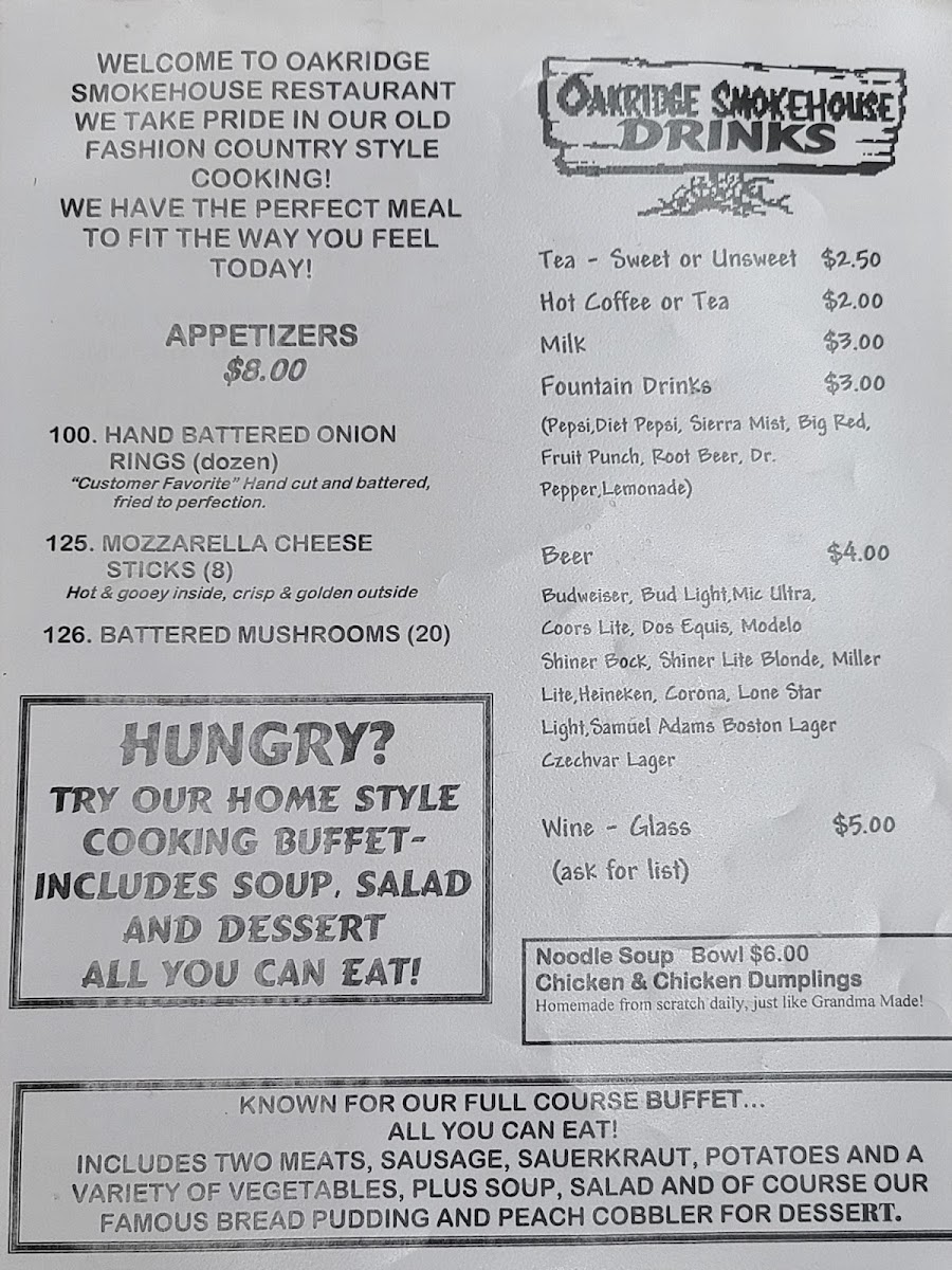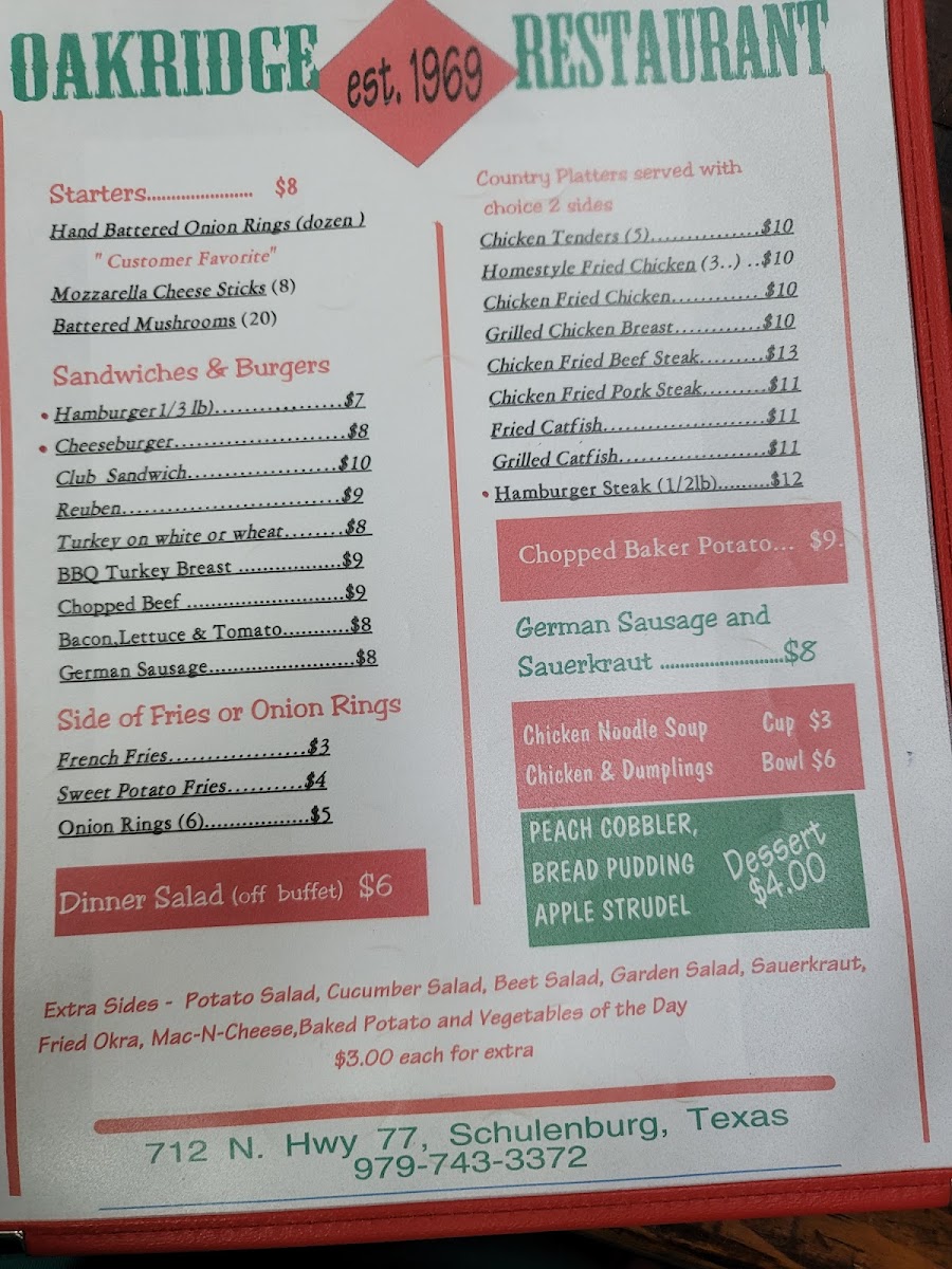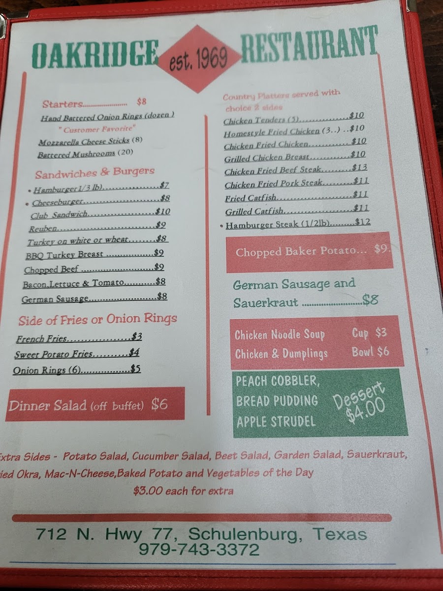 Welcome to Oakridge Smokehouse Restaurant, a culinary gem nestled in Schulenburg, Texas. This homey eatery offers a robust menu that caters to all appetites with its daily breakfast buffet and a diverse selection of sandwiches and hearty entrées. Kickstart your day with a sumptuous breakfast featuring thick-cut bacon, eggs, and country-fried potatoes for just $12.00.