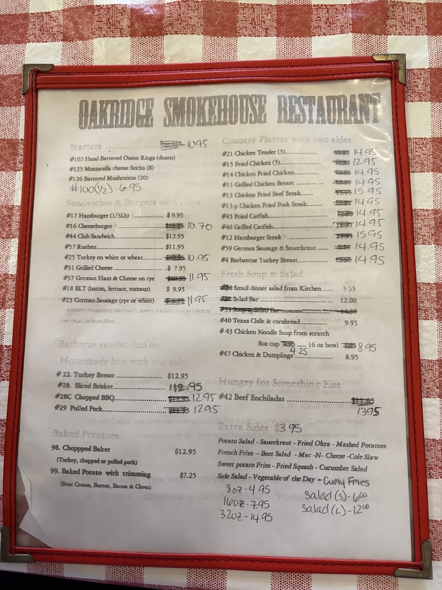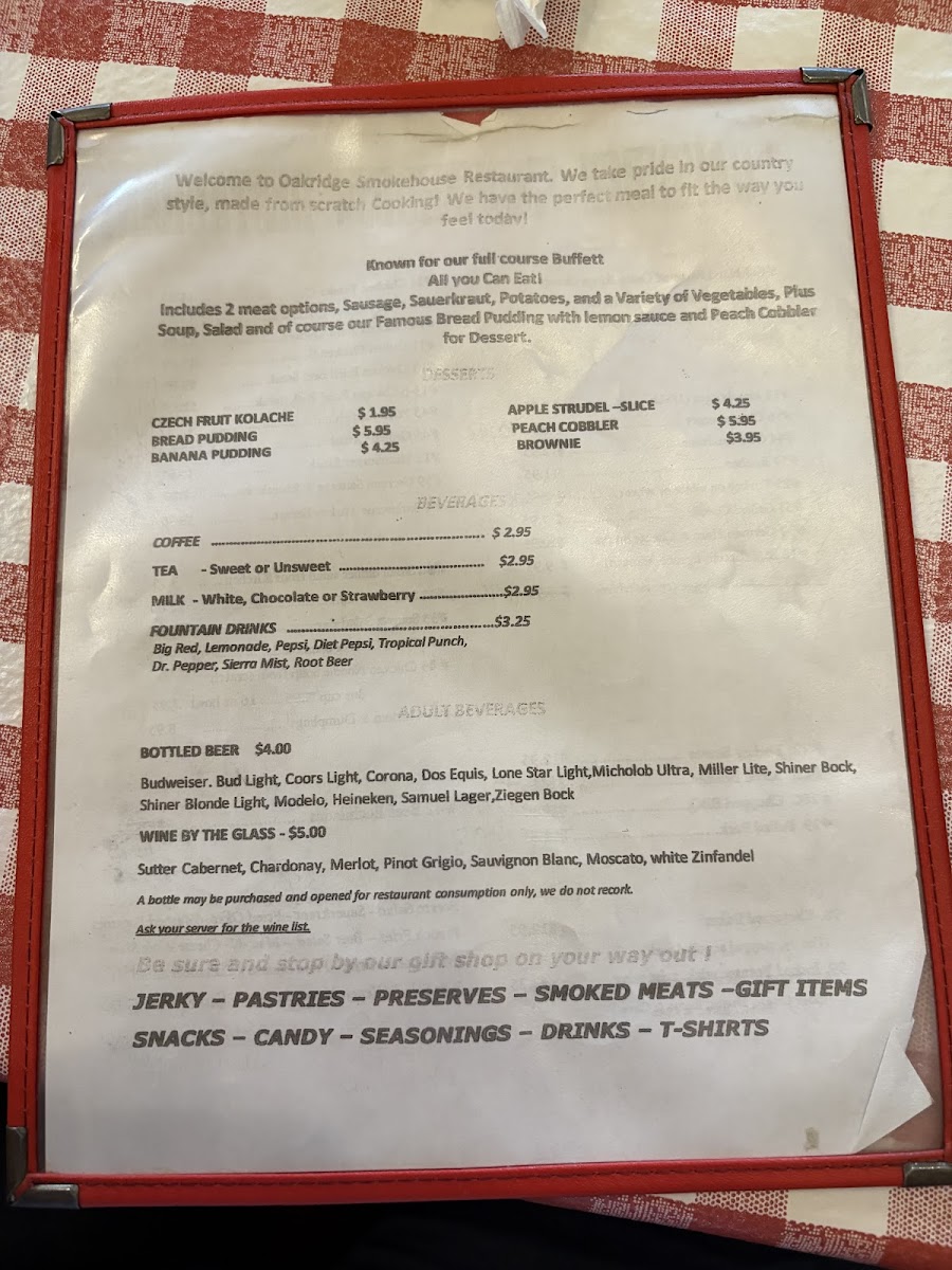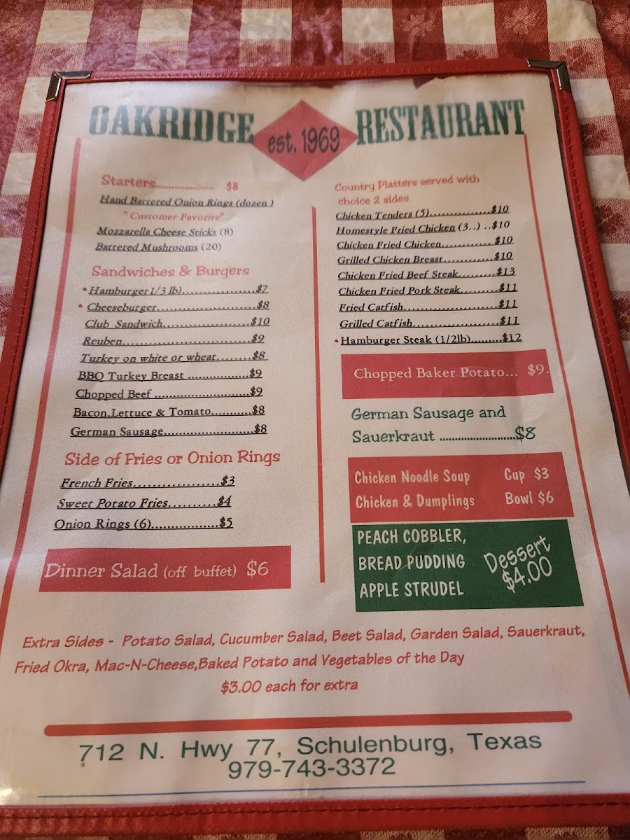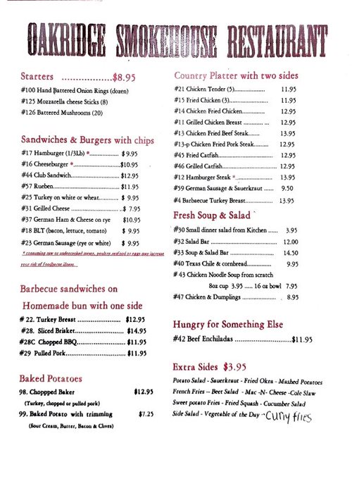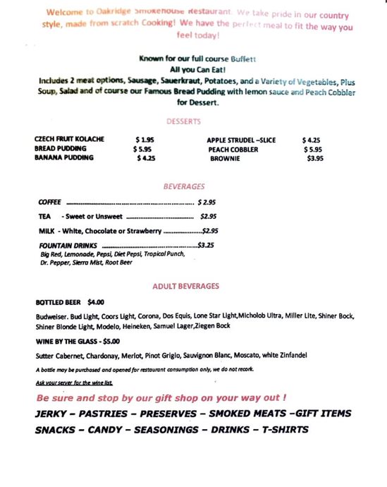 Welcome to Oakridge Smokehouse Restaurant, a culinary gem nestled in Schulenburg, Texas. This homey eatery offers a robust menu that caters to all appetites with its daily breakfast buffet and a diverse selection of sandwiches and hearty entrées. Kickstart your day with a sumptuous breakfast featuring thick-cut bacon, eggs, and country-fried potatoes for just $12.00.